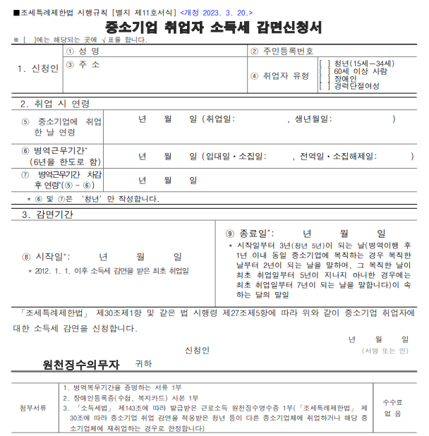 지난 '중소기업 취업자 소득세 감면 (대상, 제외대상, 감면금액, 신청방법)' 글에 이어서 오늘은 중소기업 취업자 소득세 감면 신청서 작성방법에 대해 상세히 정리해 드리겠습니다.