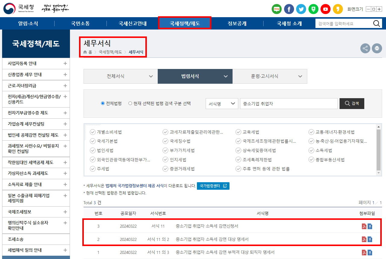 우선 아래의 국세청 홈페이지로 접속한 후, 국세정책 · 제도 → 세무서식 → '중소기업 취업자'로 검색 → '중소기업 취업자 소득세 감면신청서' 서식을 다운로드 하시면 됩니다.