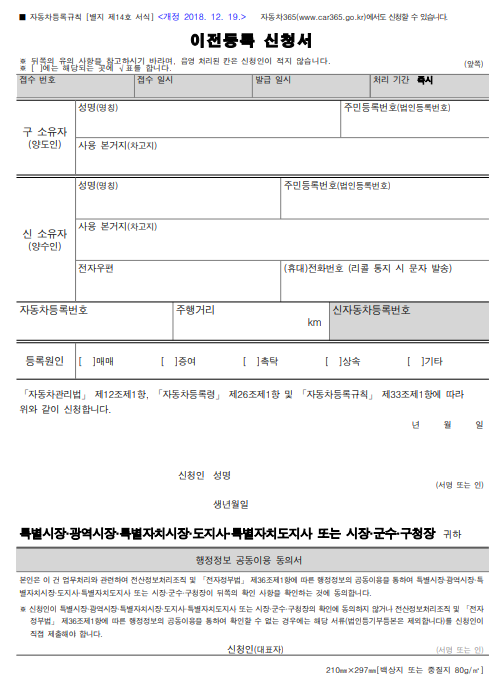 자동차 공동명의 변경 신청 방법 중 서류작성이 조금 어려울 수 있지만, 견본이 워낙 잘 작성되어 있어 어렵지 않습니다. 바쁘신 경우에는 서류 양식을 미리 다운받아 작성해서 가시면 대기 시간을 단축하실 수 있습니다.
