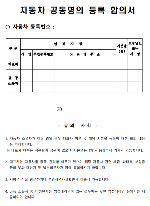 신청서 별로 견본이 아주 잘 되어 있어 그대로 작성하시면 됩니다. ③자동차 공동명의 등록 합의서에 대표자는 지분율에 상관없이 지정 가능합니다. 대표자가 세금, 과태료, 부담금 부과대상자 및 납부의무가가 되는 것입니다. 대표자에게 해당 우편물들이 발송되니 참고하여 대표자를 지정하시면 되겠습니다. 추후 변경도 가능하겠습니다.