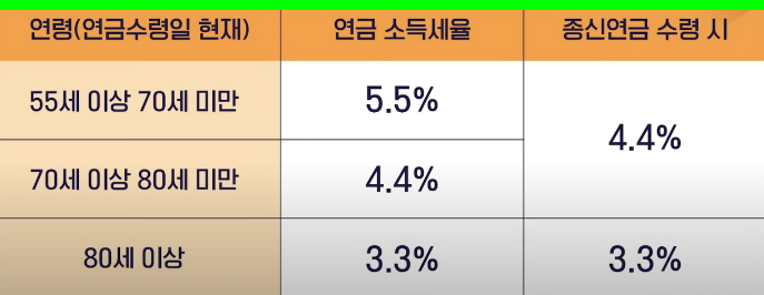 사적연금(연금저축, IRP 등)에 가입한 경우 연말정산 시 세액공제 혜택을 받게 됩니다. 그 대신 연금수령 시 과세를 하게 됩니다. 연간 연금소득이 1,200만 원 이하인 경우에는 아래의 세율로 과세됩니다.