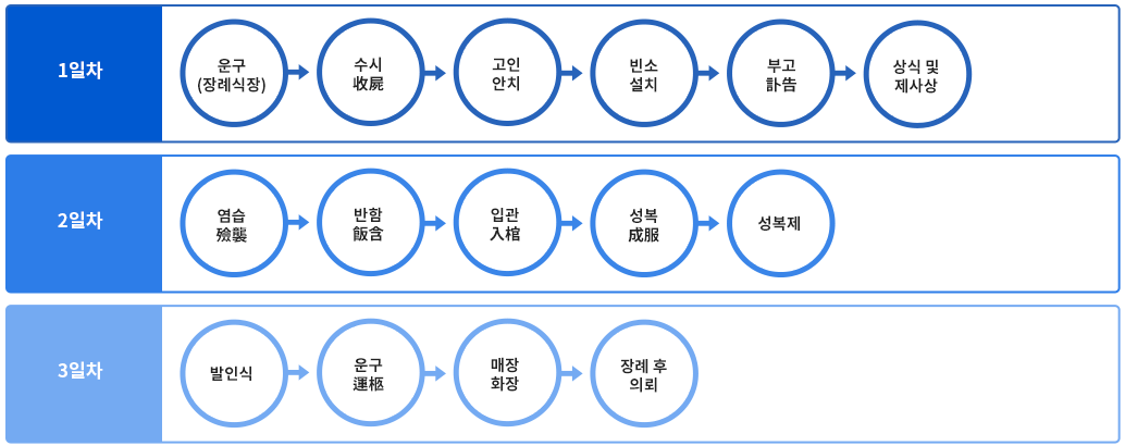 장례식장에서의 현대식 장례절차는 특별한 사정이 없는 한 3일장을 기본으로 하게 됩니다. 사망 후 당일로 수시(收屍)를 행하게 되고, 사망한 다음날 습(襲)이 끝나면 바로 소렴을 하고 입관까지 하게 되어 염습의 과정이 2일째 한꺼번에 이루어지고, 3일째 발인을 하게 됩니다.