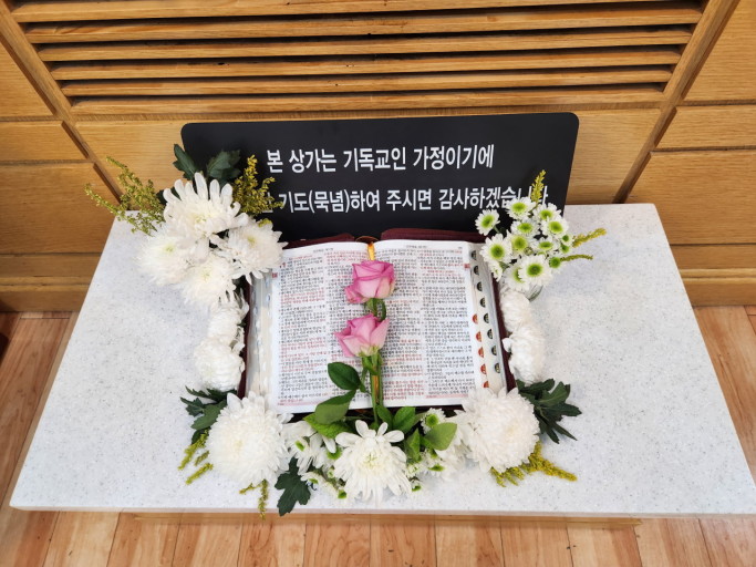 고인(성도)이 소천하게 되면 장례식장에 안치합니다. 최종적으로 장례식장이 정해지면 위로예배를 드리게 됩니다. 이때 빈소에는 꽃 장식 속에 영정사진과 직분 푯말을 놓게 되는데 고인이 생전에 사용하신 성격책을 함께 놓기도 합니다.