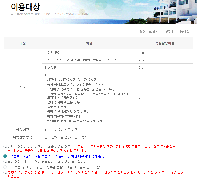 많은 사람들이 국군복지포탈에 관심을 가지지만 구체적으로 누가 이용대상인지 잘 모르는 경우가 대부분인데요. 팩트로 말씀드리자면 국군복지포탈 이용대상은 아래의 특정 대상을 중심으로 회원가입 후 회원제로 운영되고 있습니다. (단, 체력단련장의 경우 일반인, 호텔/콘도의 경우 현역병(+가족)도 사용 가능합니다.) 사실 모든 국민이 세금을 내고 있기에 모든 시설물을 함께 잘 관리하며 사용할 수 있었으면 얼마나 좋을까 생각이 들었습니다.