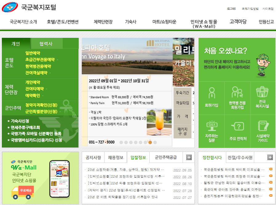 의외로 많은 분들이 국군복지포탈의 제공 서비스를 잘 모르는거 같습니다. 결론부터 말씀드리면 국군복지포탈을 이용해서 지역별 체력단련장(골프장), 호텔 콘도, 쇼핑타운을 이용할 수 있습니다. 생각보다 많은 서비스를 저렴한 가격으로 제공 받을 수 있어 사실 좀 놀랐습니다.