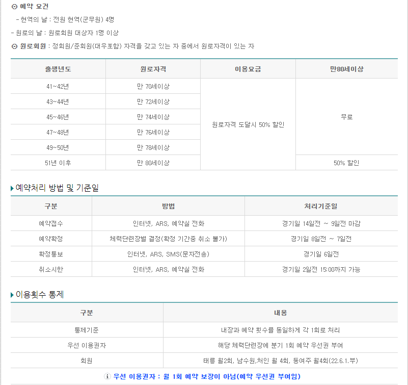 1. 현역군인(하사이상) 2. 예비역(퇴직자) 3. 군무원/군무원 퇴직자 4. 국방부 공무원 5. 국군 공무직원 6. 병역명문가 7. 사관생도, 사관(부사관) 후보생 8. 국가유공자 9. 보훈대상자(유족중 소지자) 10. 체력단련장 이용대상자