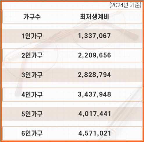 아래 표와 같이 2024년 최저생계비가 인상되었습니다. 가구원수 별로 인상된 금액을 확인해 보세요. 개인회생 신청 후 채무상환을 위한 변제금액을 결정할 때 최저생계비는 보장을 해주게 됩니다. 2024년 최저생계비 인상으로 변제금액이 줄어들 것으로 보입니다.