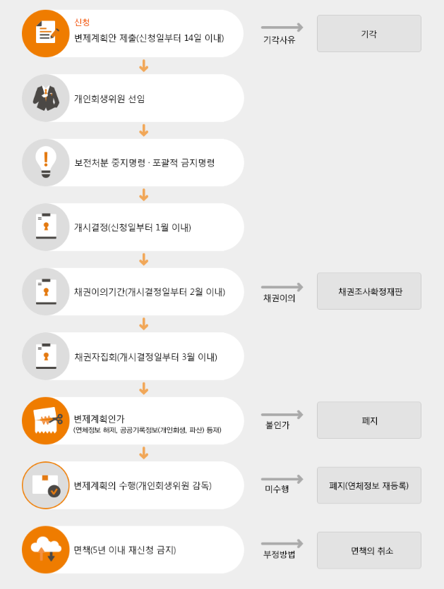 채무자는 채권자 목록과 변제계획안을 법원에 제출해야 하고 법원이 임명한 회생위원은 채무자의 재산과 수입을 조사하여야 합니다. 법원이 변제계획안을 허가하면 채무자는 변제계획에 따라 변제해야 하고 변제계획을 모두 이행하면 나머지 채무는 면책 받을 수 있습니다.
