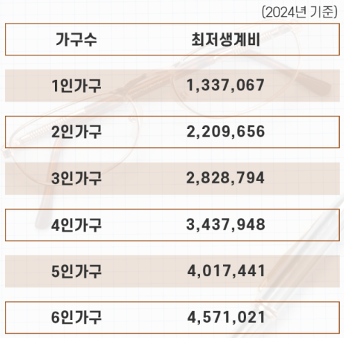 변제계획에 따라 채무를 상환하게 되더라도, 가정의 최저생계비 만큼은 보장해 주는 장점이 있습니다.최저생계비란 우리나라 기준 중위소득의 60% 해당금액을 말하며, 2024년 최저생계비는 아래와 같습니다. 개인회생 시 월 변제금은 '월 평균소득 - 가구원 수에 따른 최저생계비 = 변제금'이 됩니다.