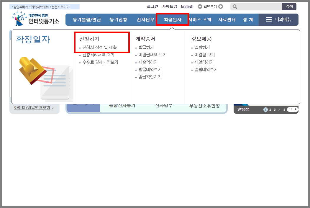 다음으로는 인터넷 확정일자 받는 방법에 대해서도 함께 살펴보겠습니다. 아래에 정리해드린 인터넷 등기소에 접속하여 확정일자도 인터넷으로 손쉽게 처리가 가능합니다.