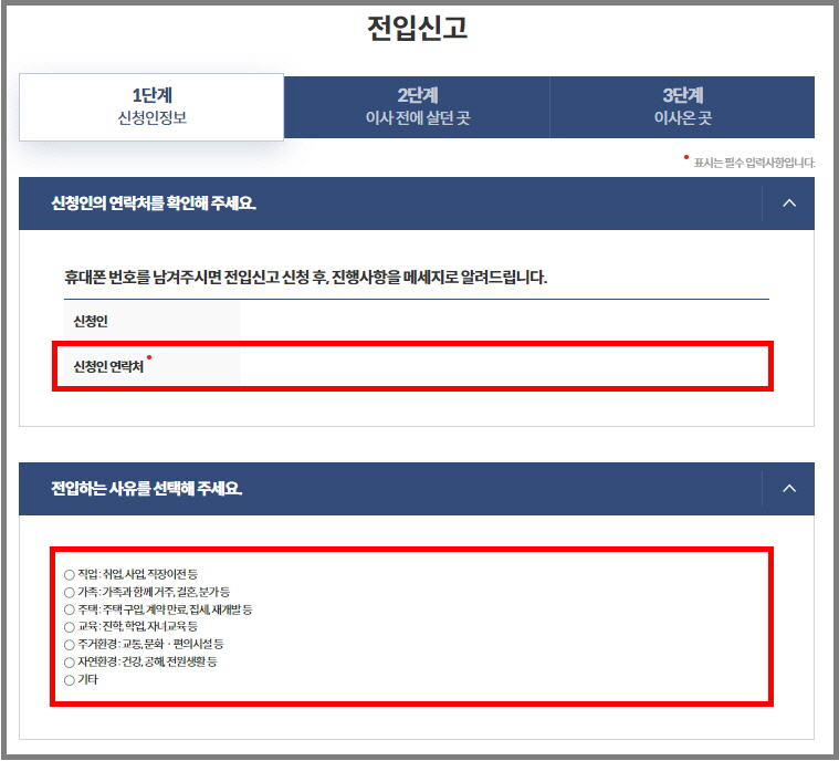 - 1단계 연락처, 전입 사유 선택 후 '다음단계' 클릭