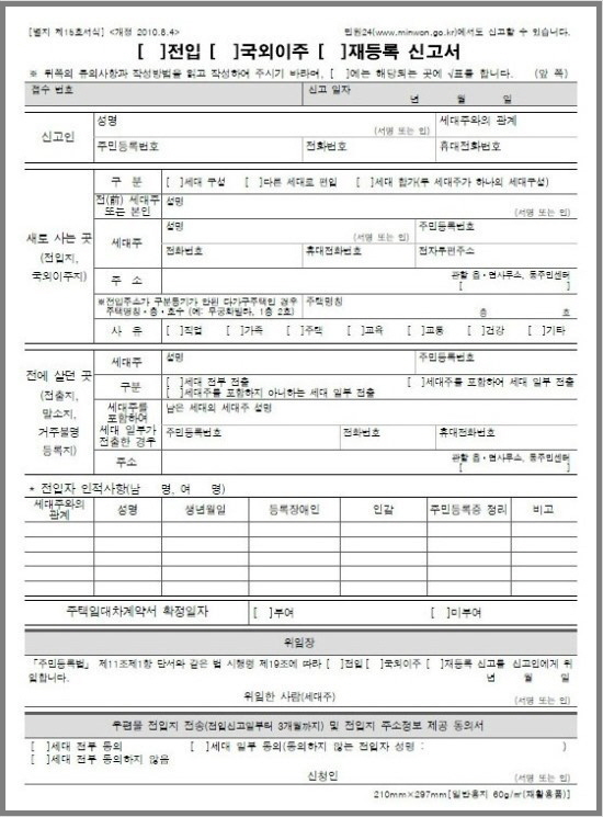 정당한 사유 없이 전입신고를 14일 이내에 하지 않을 경우 5만원 이하의 과태료가 부과됩니다. 주택임대차보호법상 임차인이 입주(실거주) 하고, 주민등록 전입신고를 마치면 그 다음날부터 대항력이 발생한다는 점을 반드시 기억해 두셔야 합니다.