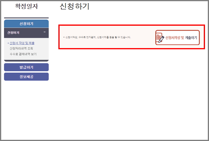 - 상단 '확정일자' 클릭 후 '신청서 작성 및 제출' 클릭