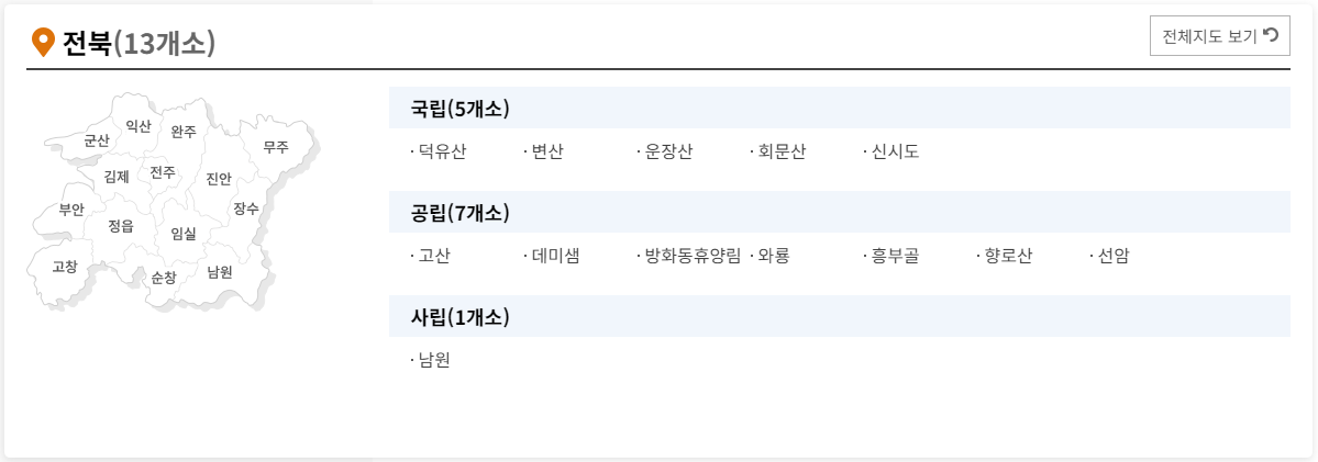 - 국립 덕유산 자연휴양림, 국립 운장산 자연휴양림, 국립 회문산 자연휴양림