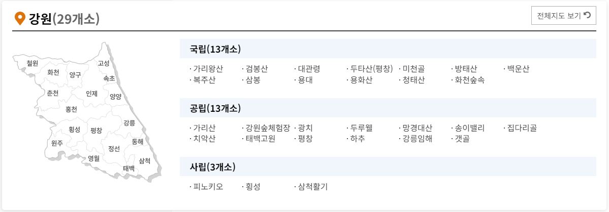 - 국립 가리왕산 자연휴양림, 국립 검봉산 자연휴양림, 국립 대관령 자연휴양림, 국립 두타산(평창) 자연휴양림, 국립 미천골 자연휴양림, 국립 방태산 자연휴양림, 국립 백운산 자연휴양림, 국립 복주산 자연휴양림, 국립 삼봉 자연휴양림, 국립 용대 자연휴양림, 국립 용화산 자연휴양림, 국립 청태산 자연휴양림, 국립 화천숲속 자연휴양림