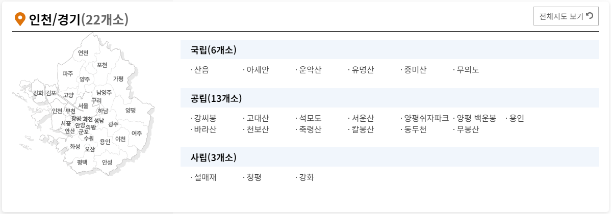 - 국립 산음 자연휴양림, 국립 아세안 자연휴양림, 국립 운악산 자연휴양림, 국립 유명산 자연휴양림, 국립 중미산 자연휴양림