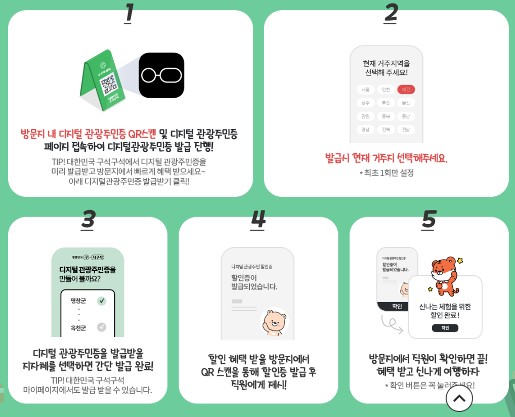 디지털 관광주민증 발급 및 사용방법은 위의 이미지를 참조 하시면 되겠습니다.