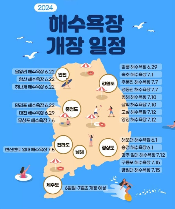 많은 사람들이 제일 궁금해 하는 2024년 전국 해수욕장 개장일과 폐장일에 대한 정보부터 함께 살펴보겠습니다. 전국 해수욕장 중에서 개장이 가장 빠른 곳은 부산 해운대 · 송정 해수욕장으로 6월 1일부터 개장하였습니다.