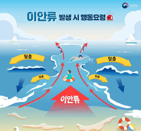 수영 중 이안류에 휩쓸렸다면 반드시 아래의 대처방법에 따라야 합니다. 즐거운 피서에서 안전보다 더 중요한 것은 없습니다. 이안류 예측정보 확인, 이안류 발생 시 대처방법까지 잘 숙지하셔서 안전한 물놀이를 즐기셨으면 합니다.