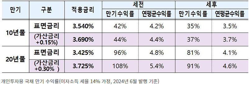 이번 6월에 발행되는 개인투자용 국채의 수익률과 기간도 함께 살펴보겠습니다. 개인투자용 국채의 투자 기간은 10년물과 20년물이 있습니다. 개인투자용 국채 10년물과 20년물을 만기까지 보유시 수익률이 어마어마 합니다.