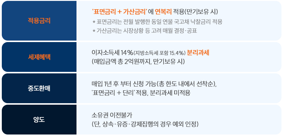 마지막으로 세제혜택도 추가로 제공이 됩니다. 매입금액 총 2억 원까지는 이자소득에 대해 15.4%의 분리과세가 적용됩니다. 종합과세가 아닌 분리과세가 적용되는 것도 큰 장점이 되겠습니다. 단, 추후 세법 개정으로 변경될 수 있습니다.
