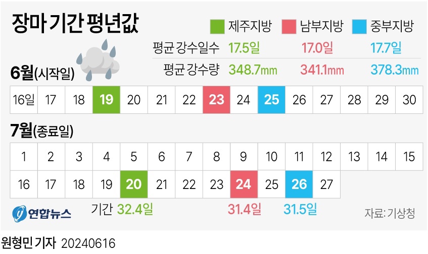 • 장마 예상기간: 6월 19일~7월 20일 (32.4일)