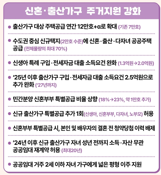 • 출산가구 주택공급 확대(연 7만 → 12만호)
