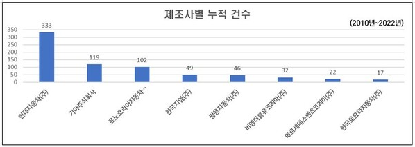 먼저, 위 13년간 누적 급발진 신고 건수를 살펴보면 현대 기아차가 452건(59%)으로 가장 많았습니다. 제조사별 급발진 신고 누적 건수 순위를 정리해 드리면, 현대(333건) > 기아(119건) > 르노(102건) > 한국GM(49건) > 쌍용자동차(46건) > BMW(32건) > 벤츠(22건) > 도요타(17건) 순입니다.