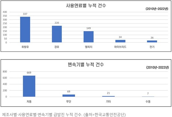 또한, 사용연료별로 순위를 정리해 보면 휘발유(337건) > 경유(220건) > LPG(149건) > 하이브리드(34건) > 전기(26건) 순입니다. 변속기별로 순위를 정리하면 자동변속기(669건) > 무단변속기 CVT(69건) > 기타(21건) > 수동변속기(7건) 순입니다. 최근에는 전기차의 급발진이 증가 추세에 있으며, 급발진의 대부분이 자동변속기 차량에서 발생했음을 알 수 있습니다.