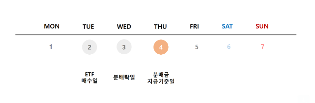 월배당 분배금을 지급받기 위해서는 지급기준일까지 ETF를 보유해야 합니다. 월배당 ETF를 매수한 시점에서 2거래일이 경과해야 결제가 되기때문에 분배금 지급기준일의 2거래일 전에 ETF를 매수해야 한다는 점을 체크해 두셔야 합니다.