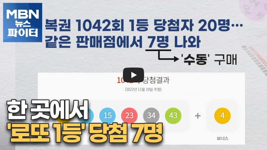 ▶2022년 대한민국의 칠곡에서 1명이 수동으로 구매한 7개의 로또 1등에 당첨