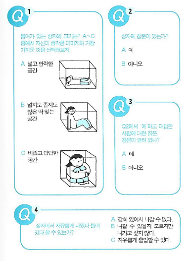 '상자 속에 들어가 있는 나'의 모습은 당신이 바깥 세상과의 소통 상ㅌㅐ를 어떻게 생각하고 있는지. 즉 '자기 감각'을 파악할 수 있는 지표가 된다.