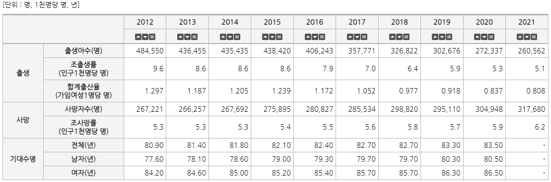 출생율의 감소는 이미 읍, 면 단위의 소규모 인구 지역에서는 산부인과 병원의 폐업으로 이슈가 된 적이 있다. (이미 다수 읍, 면지역에는 산부인과가 없는 곳이 많다) 오늘은 이슈 점검 차원에서 출생아수, 합계출산율, 남여별기대수명, 사망률을 그래프와 통계표로 점검하고 지표해석, 국제간 비교등 다양한 관점에서 소개해 드리겠습니다.