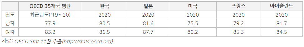 -한국 남자 기대수명 80.5년은 OECD국가평균(77.9년)보다 2.6년, 여자 기대수명 86.5년은 OECD 국가평균(83.2년)보다 3.3년 높음.
