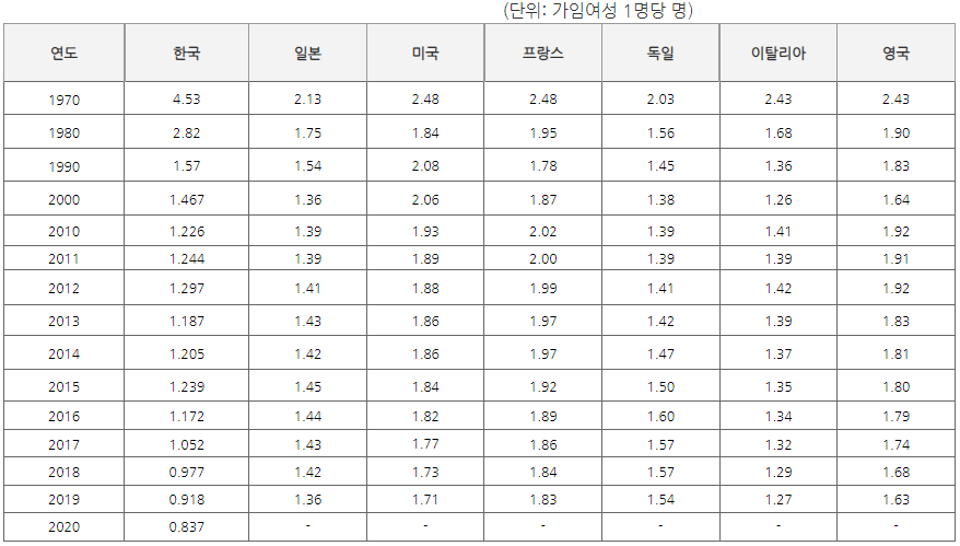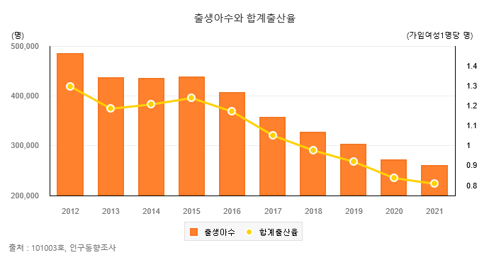합계출산율: 한 여성이 가임기간(15~49세)동안 낳을 것으로 예상되는 평균 출생아 수를 나타내는 지표