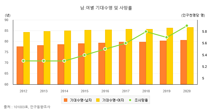 -2020년 출생아의 기대수명은 남자 80.5년, 여자 86.5년으로 남녀간 차이는 6.0년으로 전년과 동일