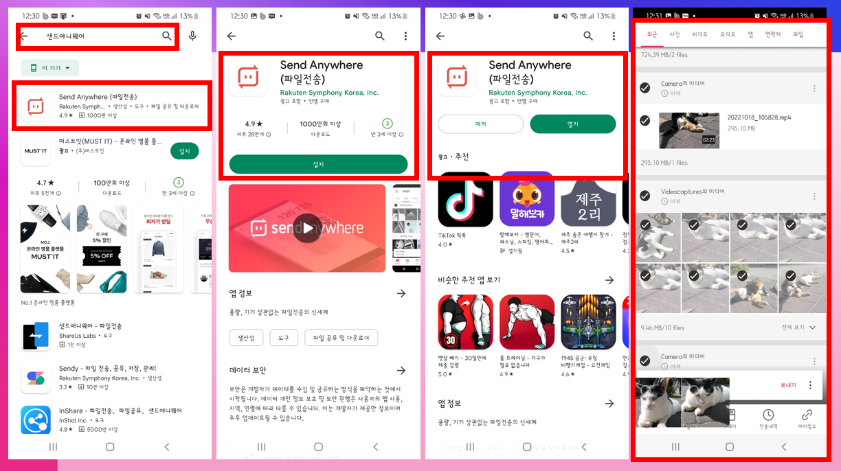 샌드애니웨어는 전송하는 기기와 전송받는 기기 양쪽 모두에 설치되어야 한다. 다만 PC의 경우 샌드애니웨어 홈페이지에서 설치 없이 사용 가능하다. 샌드애니웨어 설치방법을 결론부터 말씀드리면 폰에서는 구글 플레이 스토어 접속 후 "샌드애니웨어"로 검색 후 설치, PC에서는 네이버나 구글 검색창에 "샌드애니웨어"로 검색 후 홈페이지 접속(설치, 로그인 필요없음) 하면된다. 개인적으로 사용하기 쉬운 인터페이스가 눈에 띄며, PC에서는 홈페이지 접속 후 설치, 로그인 없이 사용가능해서 좋다.