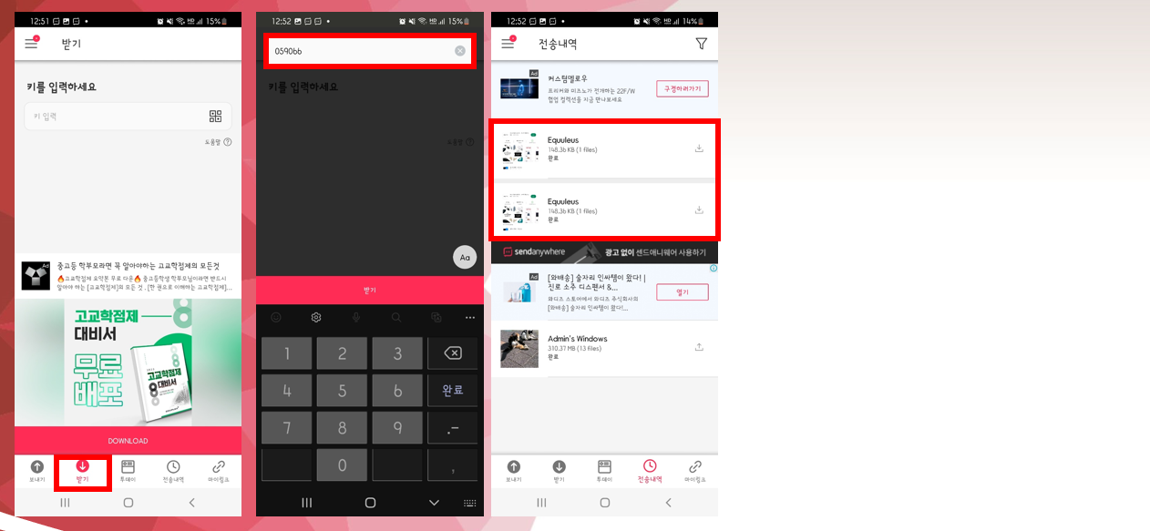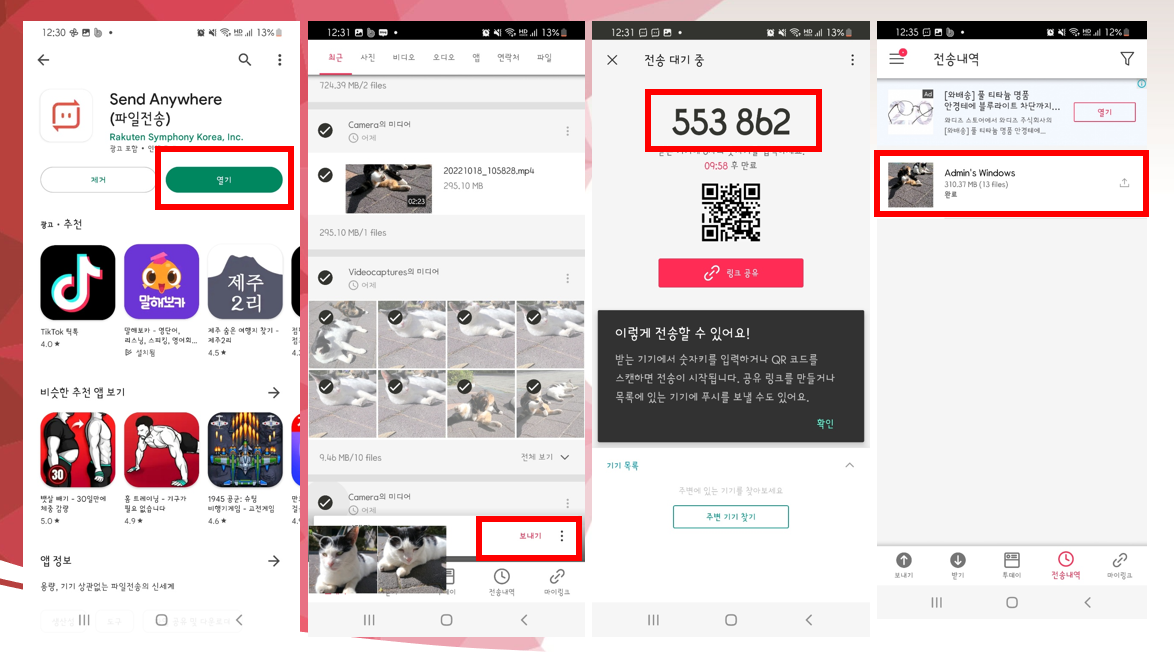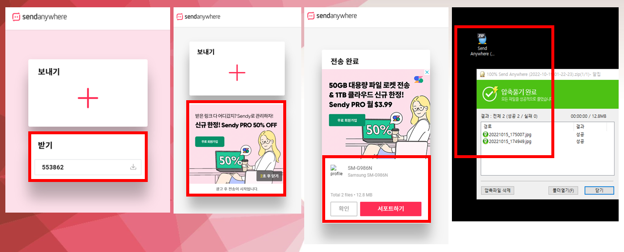 휴대폰에서 보낼 파일 선택 → 하단의 [보내기] 클릭 → 6자리 키(10분간 유효) 표시 → PC에서 6자리 입력후 [받기] 클릭 → 5초 광고 시청 → PC에 파일 전송 완료(압축 해제 후 사용)