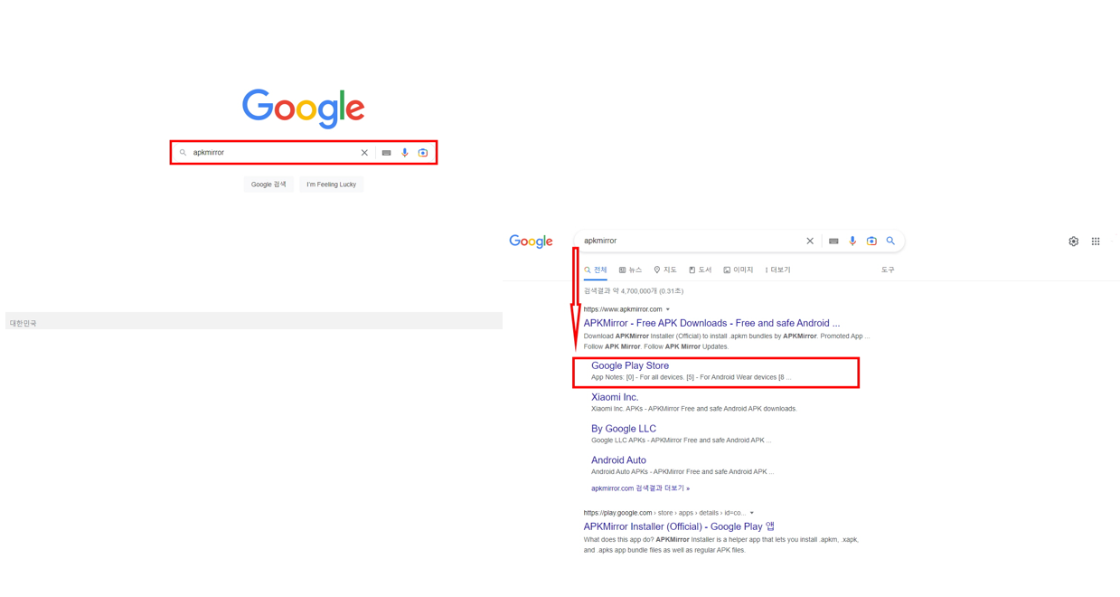 1. 구글 검색창에 'apkmirror' 입력 후 검색 → 2. 검색 결과에서 apkmirror 웹사이트가 아닌 바로 아래 'Google Play Store'를 클릭