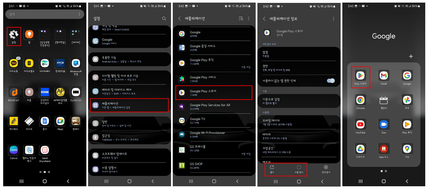 1. 구글 플레이 스토어가 사용중지로 화면에서 사라진 경우