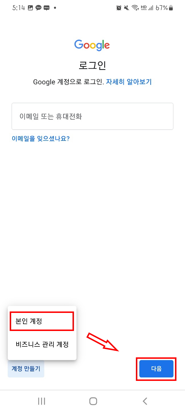 3. 하단의 [본인 계정] 클릭 후 다음 버튼을 누른다.
