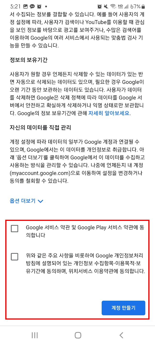 10. 이용약관 체크박스에 모두 클릭하여 동의 후 계정 만들기를 눌러 줍니다.