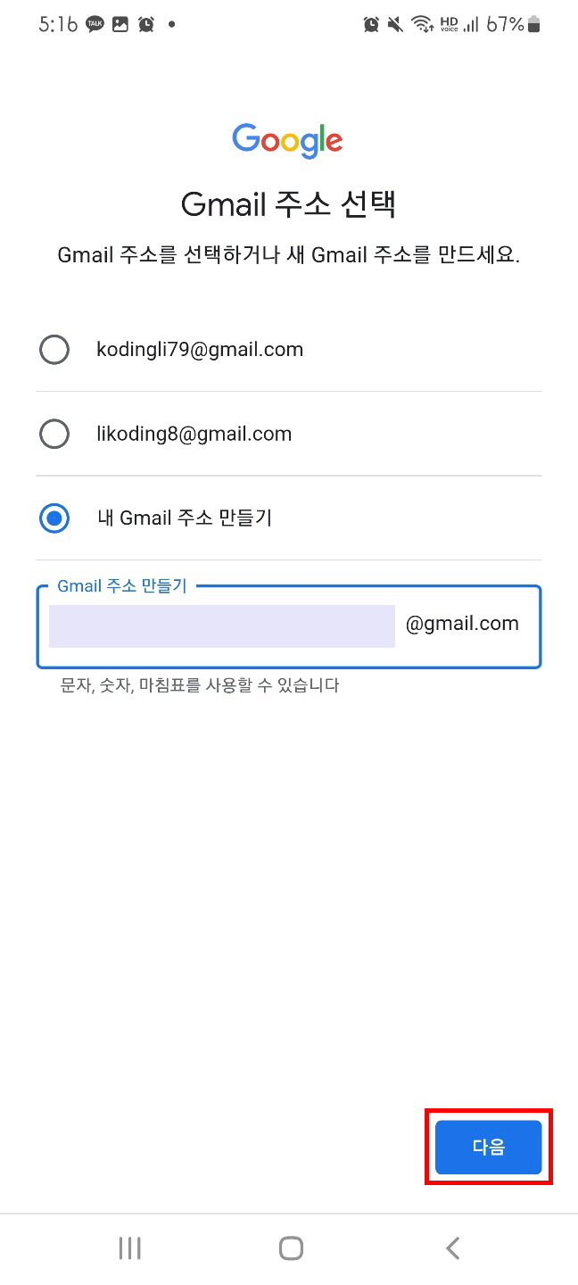4. 기억하기 쉬운 메일 주소를 입력한 후 다음 버튼을 눌러준다.