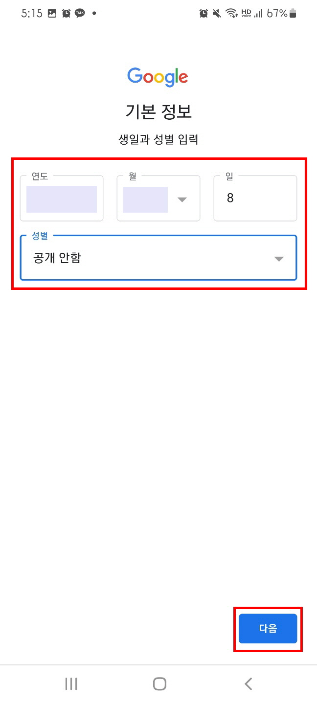 5. 해당 화면에서 생일/성별 입력 후 다음 버튼을 클릭 합니다. (단, 미성년자가 아니어야 합니다.)