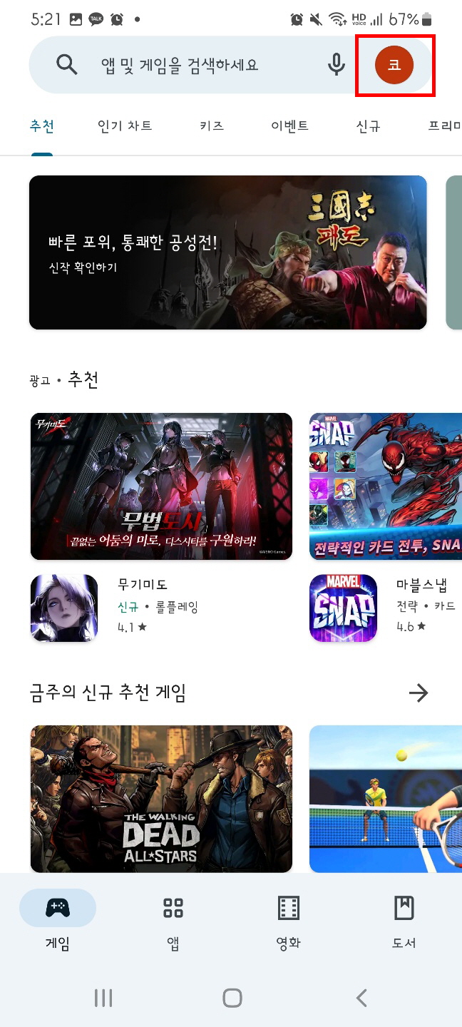 1. [구글 플레이 스토어] 클릭 후 우측 상단의 [프로필] 탭으로 이동한다.