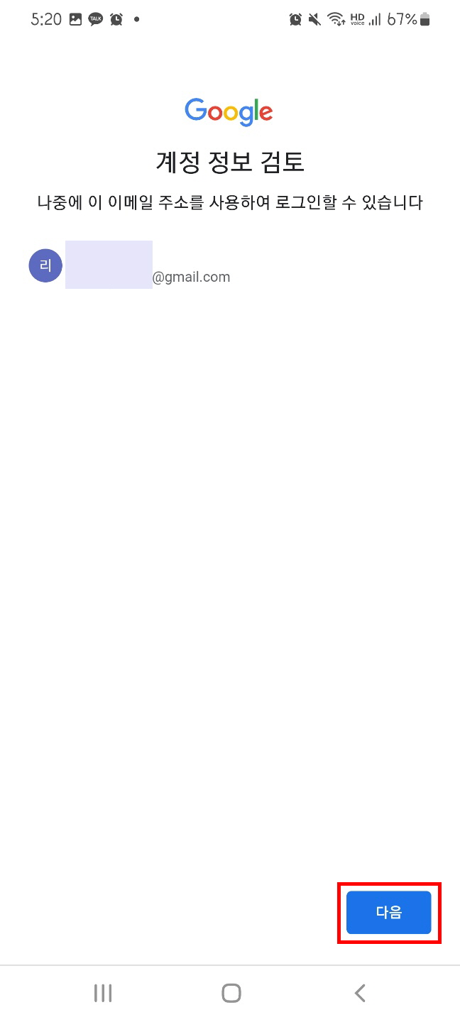 9. 계정 정보 검토 화면 하단의 다음 버튼을 눌러준다.