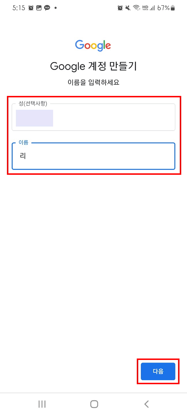 6. 성/이름 작성 후 다음 버튼을 클릭해 줍니다. (성과 이름도 임의로 설정 가능합니다.)