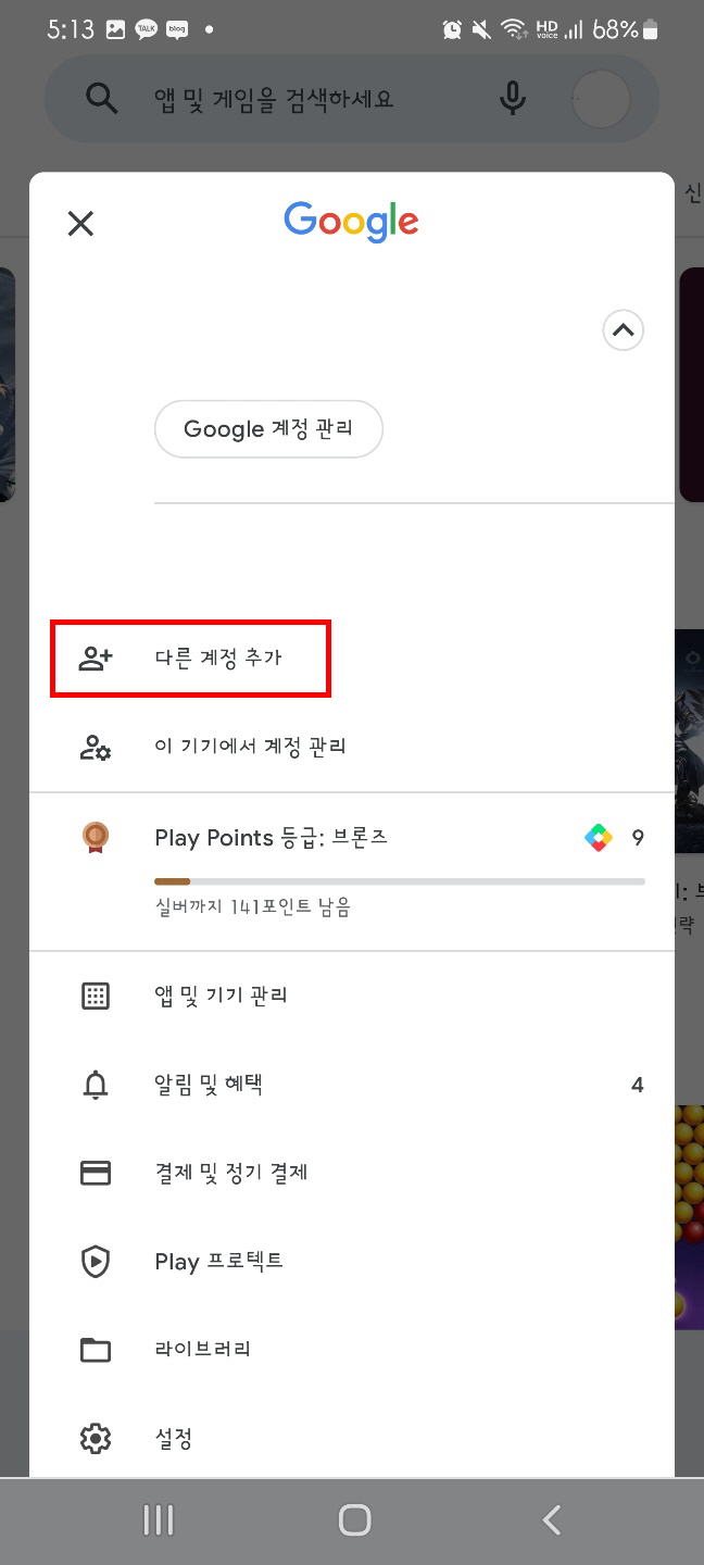 2. 구글 계정 오른쪽 화살표 클릭 후, 아래의 [다른 계정 추가]를 눌러서 화면을 이동한다.