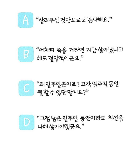 낙석사고로 죽을 고비를 넘기고 구사일생으로 살아났다. 그런데 천사가 나타나서 "아직 이 세상을 떠날 때가 아니니 이번에는 살려줄게요. 하지만 당신에게 남은 시간은 일주일뿐입니다. 일주일 후에 다시 오겠어요."하고 예언했다. 당신은 천사의 예언을 듣고 뭐라고 말했을까? A ~ D 중 선택해 보세요.