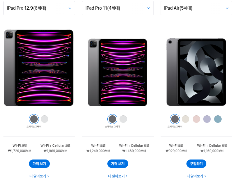 그냥 보기에도 상위버전의 모델이 더욱 이쁘고 기능을 많이 갖추고 있는 만큼 한 번 보고 나면 안 사고는 못 견딘다는 아이패드 병이라는 용어가 있을 정도라고 하니!? 구매전 본인이 어떤 용도로 사용할 것인지를 구분하고 목적에 맞게 구매하는 것이 현명한 소비가 될 것 같습니다. 또한, 고가의 제품인 만큼 구매전 매장에 방문하여 꼭 체험 후 구매하시는 것을 추천드립니다.